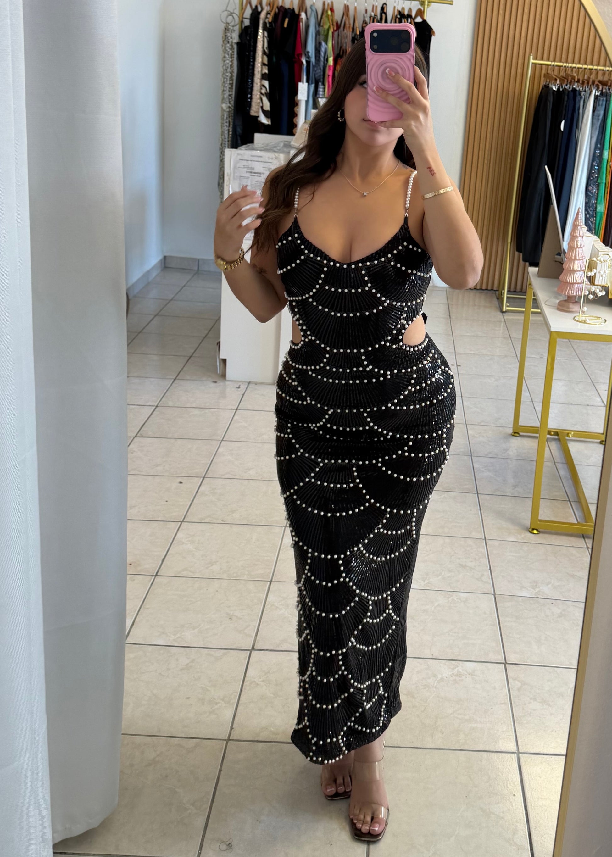 Hermoso vestido en lentejuelas y sus detalles en perlas!