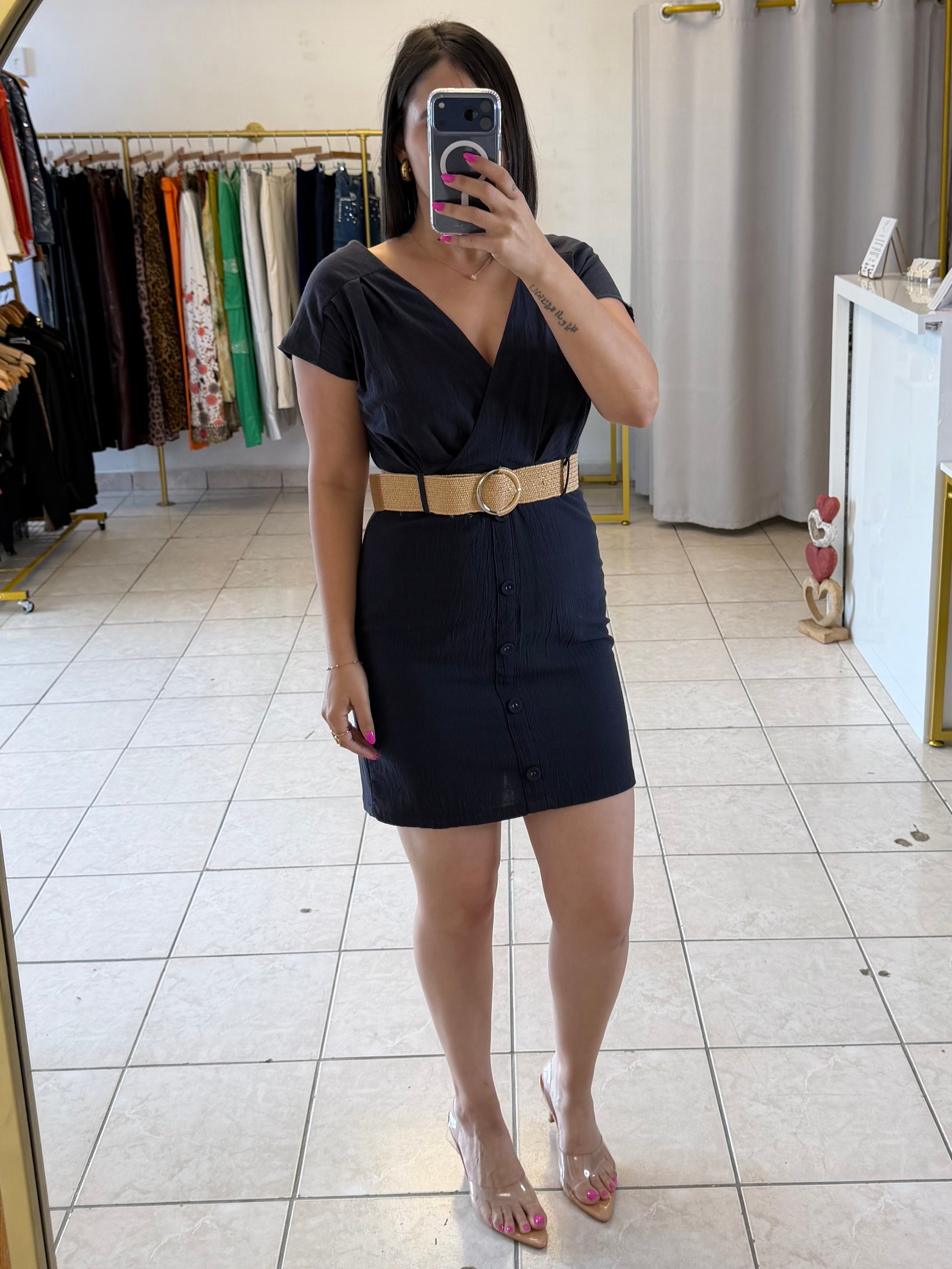 This black dress features a comfort fabric design with belt adjustment detail.